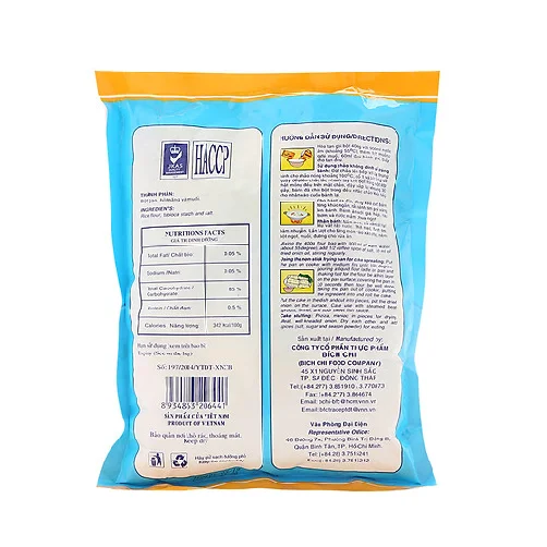 Bột bánh cuốn Bích Chi có thành phần từ gạo tẻ và muối nguyên chất, rất an toàn và bổ dưỡng. Bột có đặc tính dẻo, dai, màu trắng tự nhiên rất thích hợp làm các lọai bánh như: bánh bò, bánh cuốn, bánh lọt, chả giò rế, và các loại thực phẩm chiên giòn… Thành phần nguyên liệu được lựa chọn kỹ lưỡng, không chứa hóa chất độc hại, an toàn cho người dùng. Sản phẩm được sản xuất trên quy trình công nghệ hiện đại, được kiểm duyệt chặt chẽ, đảm bảo chất lượng.