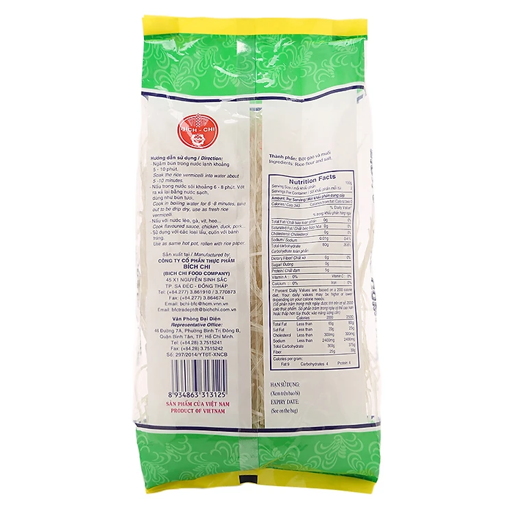 Bún tươi Bích Chi được sản xuất trên dây chuyền hiện đại, với nguyên liệu hoàn toàn tự nhiên. Sản phẩm được làm từ bột gạo và muối, không sử dụng chất bảo quản, không phụ gia, đảm bảo an toàn cho người sử dụng. Được sản xuất trên quy trình đảm bảo vệ sinh, sản phẩm không lẫn các tạp chất, mang lại sự ngon miệng cho người ăn. Khi chế biến, sợi bún có vị mềm, màu trắng đục tự nhiên, hương vị thơm ngon, hấp dẫn người dùng.