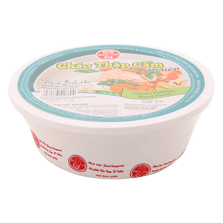 Cháo Thập Cẩm Ăn Liền Bích Chi Tô 60g x Thùng 12 Tô được chế biến từ gạo có chất lượng tốt nhất mang đến một sản phẩm an toàn và tiện lợi, giúp tiết kiệm thời gian cho người dùng. Bạn chỉ cần vài phút cho khâu chuẩn bị và chế biến là đã có ngay món cháo nhiều dinh dưỡng, dùng như một bữa ăn nhẹ hàng ngày. Cháo có thành phần gồm gạo thơm, nếp, bột tôm, bột cua dầu thực vật, đường, bột ngọt, tiêu, hành.