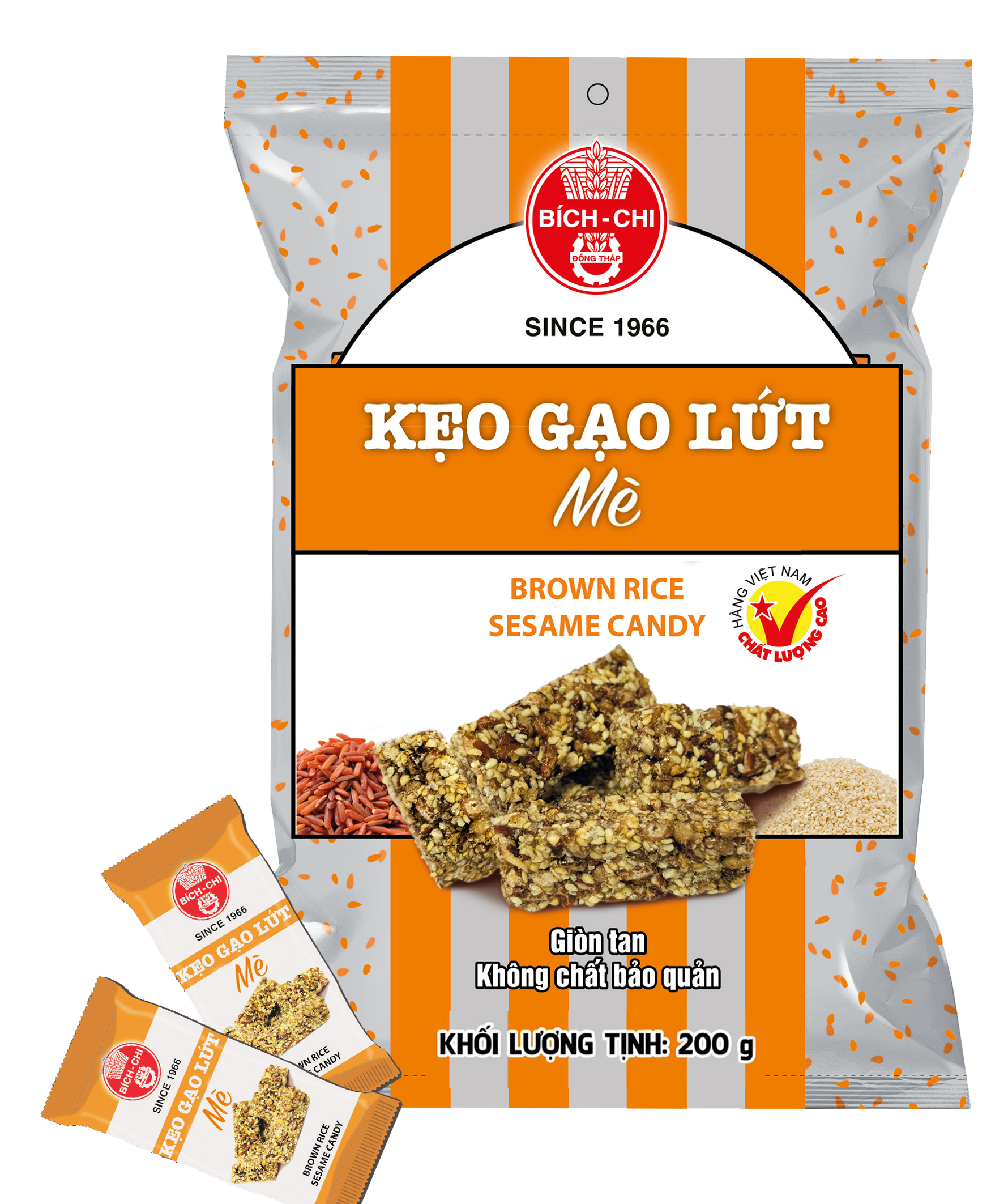 Kẹo gạo lứt mè Bích Chi là sự kết hợp hài hòa giữa hạt gạo lứt giòn tan và hạt mè thơm lừng. Kẹo với vị ngọt thanh tao của đường cát, cái vị bùi bùi của mè rang và mùi thơm của gạo lứt… tất cả làm nên một thanh kẹo giòn tan hấp dẫn lòng người. Không chỉ ngon mà kẹo còn thích hợp làm món cứu đói hay nhăm nhi với tách trà vào giờ nghỉ tại công sở. Kẹo gạo lứt mè đóng gói từng viên nhỏ gọn, giúp kẹo luôn giữ được độ giòn và hợp vệ sinh.